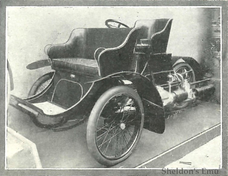 Whatever else people may think of that startling little three-wheeler the Arielette, all must acknowledge it contains three features which every tricar in the show ought to have embodied : first, a horizontal engine, which renders the design of thermo-syphon cooling so simple and unobtrusive; then, the extension of the frame behind the rear wheel, allowing a very valuable extra cross-stay to be fitted; and lastly, an outside flywheel. The clutch is so fashionable nowadays that 1 am doubtful how the public will take to the flat belt and jockey pulley; but. mechanically, it is entirely practicable in careful bands.