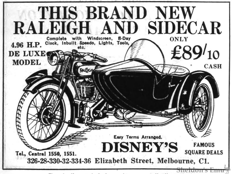 A third shop was acquired about two years later in order to cope with the distribution of Raleigh motor cycles, for which Disney's had been appointed sole Victorian agent.