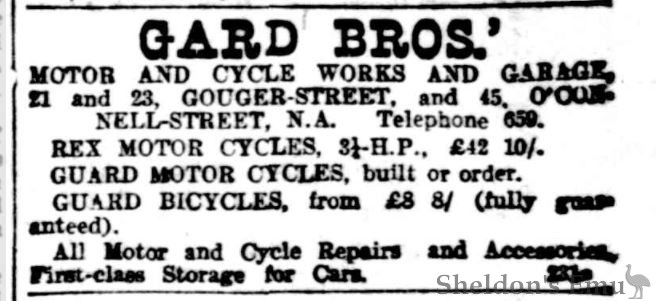 Advertisements for 1908 spoke of Guard Cycles and Rex Motor Cycles - there was no further mention of the Guard motor cycle until 1920, when they advertised the Guard JAP which was most likely a rebadged machine supplied by J.N. Taylor & Co.