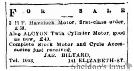 In 1915 Bilyard was listed as a Triumph agent, and later he partnered with James D. King (aka Sim King) of Launceston to import Triumph and BSA, and the firm became Bilyard and King with stores in both cities. They produced motorcycles name "Bilyard & King" around 1924.