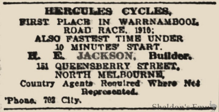 In 1916 Jackson offered the Hercules with JAP 4 h.p., Precision 4½ h.p. and Precision Junior, LMC 4 h.p., Villiers 3½ h.p., Sarolea 6 h.p. 3 speed, in addition to the "colonial" engine.