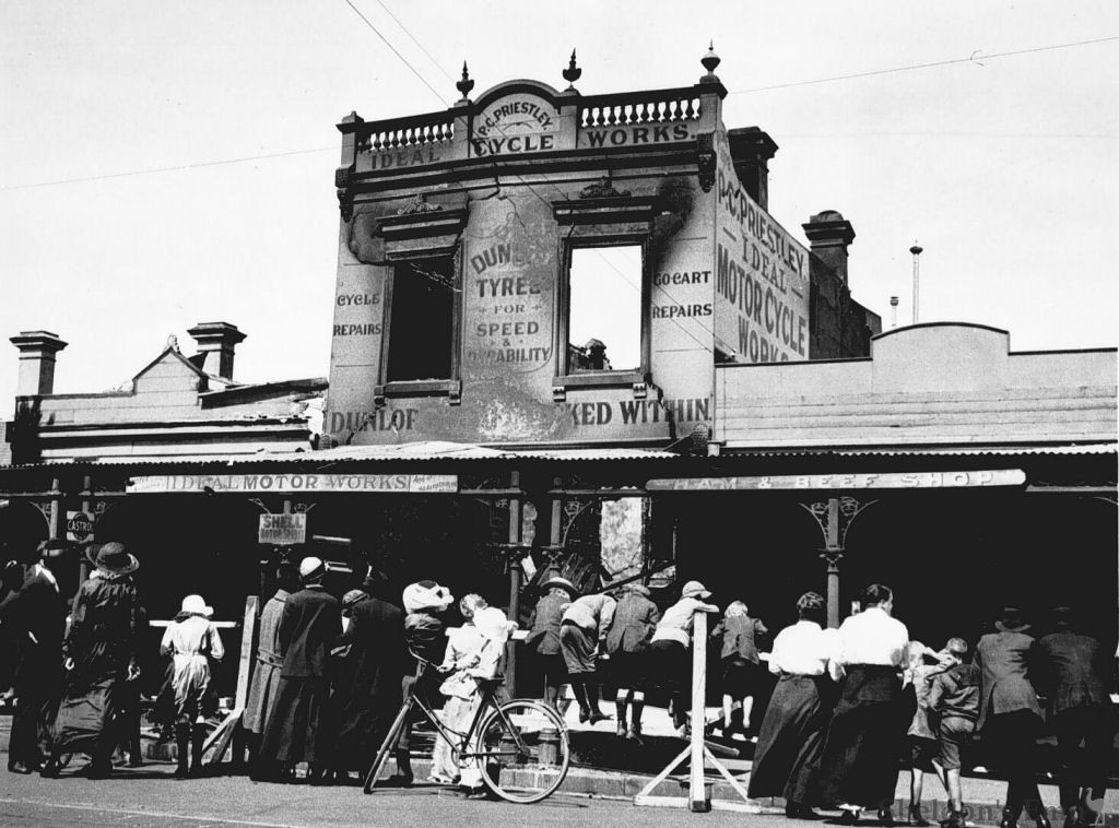 P.C. Priestley's Ideal motor cycle works after it has been gutted by fire. A number of women and children are inspecting it from outside a barricade.