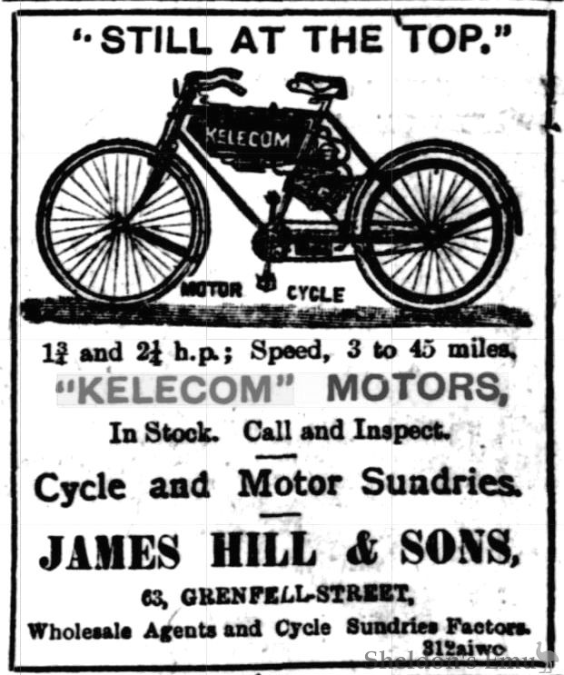 James Hill & Sons of 63 Grenfell Street, Adelaide, assembled motorcycles using Kelecom engines from 1902 to 1904, most of which were sold with the Kelecom name on the tank. The engine was named after Belgian engineer, Paul Kelecom. The 1902 machines used 1¾ or 2¼ hp engines in a BSA bicycle frame set, with the engine mounted on the seat tube. In mid-1903, the engine was mounted in the now conventional position in front of the pedal bracket, with choice of 1¾, 2 ¼, 2 ¾ or 3¼ hp engines.