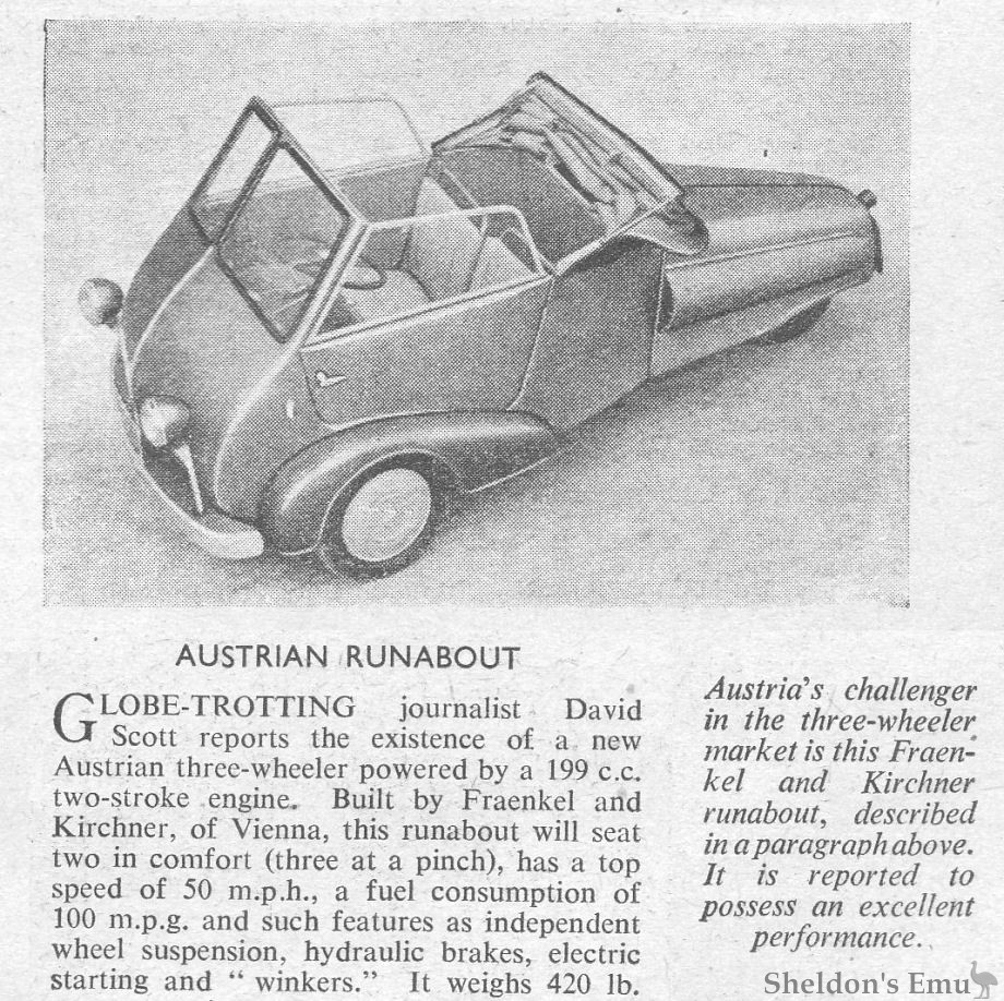 A 3-wheeler built in Austria 1952-1953 using a Rotax 199cc engine. There were several designs, one of them notable for steering via the driven rear wheel. The vehicles seated two, had a generous carrier at the rear, and looked rather like a golf cart.