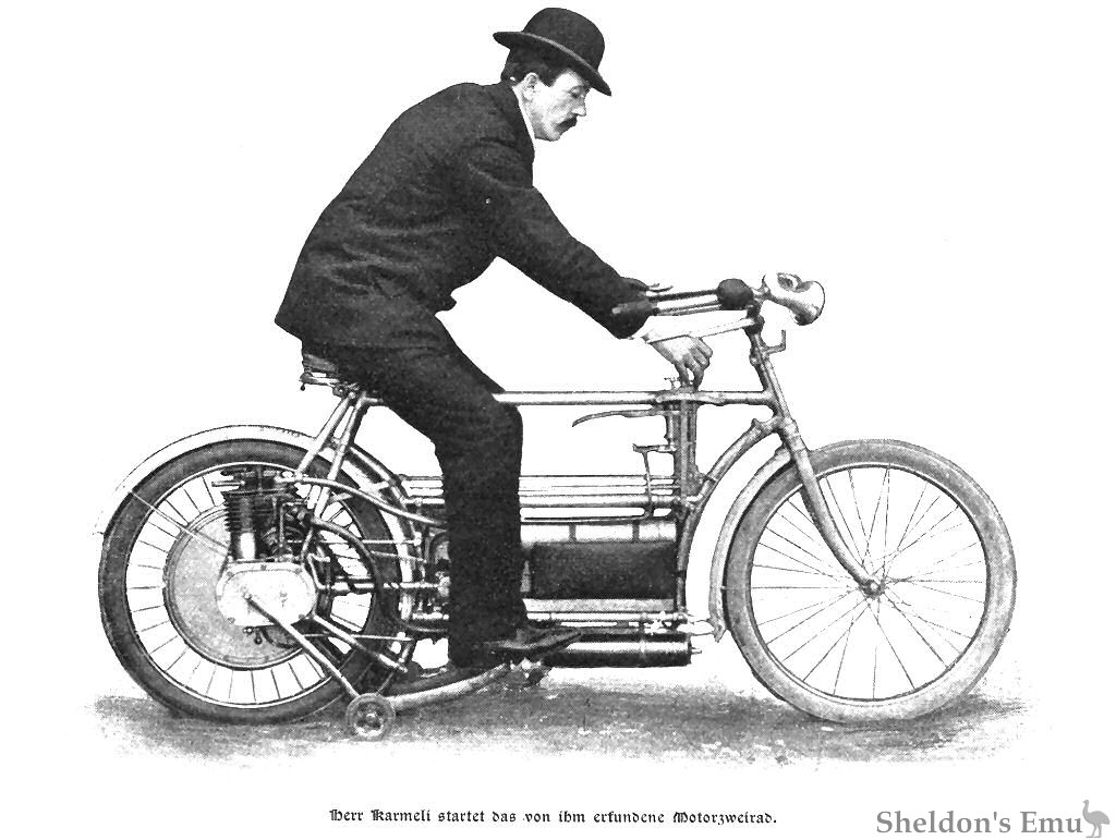 The two-speed 3½ h.p. parallel-twin was mounted adjacent to the rear wheel, and the machine could reportedly achieve 80 km/h. Its last appearance was at the 1905 Vienna Auto Show.
