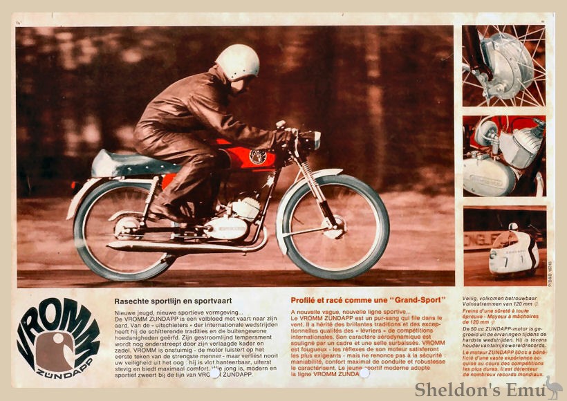 In 1968 Moorkens created the Vromm brand, again a German engine in an Italian chassis. The machine had a 3-speed 50cc Zundapp engine and was quite powerful, too much so for France which declined permission for import although it was initially advertised in French-language journals. It was designed to compete with the Flandria but was slightly slower - although far faster than the legal limit for such machines in most countries.