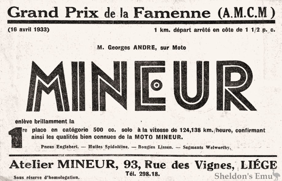 Paul Mineur built his motorcycles in the Leige factory from 1924 to 1928. Initially he fitted Bradshaw engines, and later used MAG, JAP and Sarolea engines of 348cc to 496cc in SV and OHV configurations. Output was rarely more than 12 to 15 units per annum.