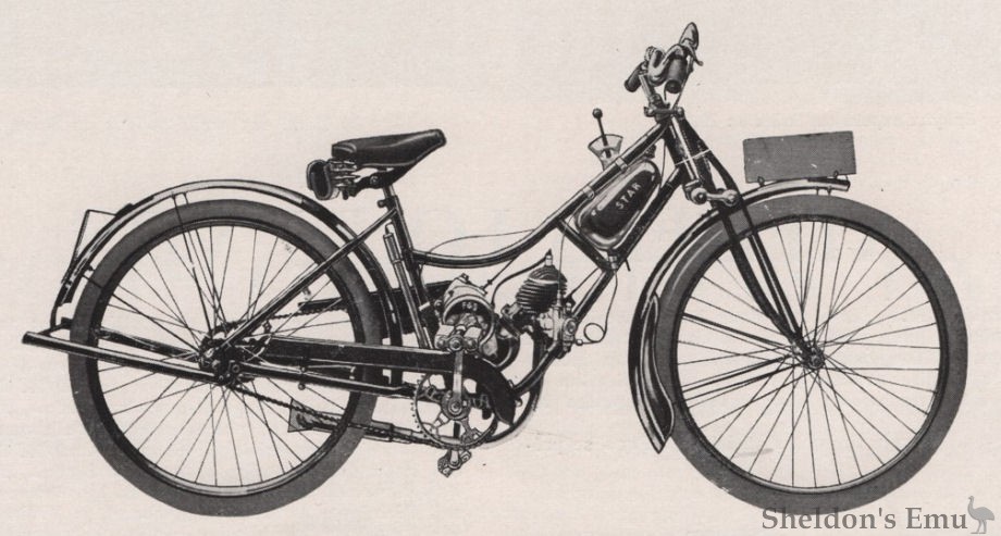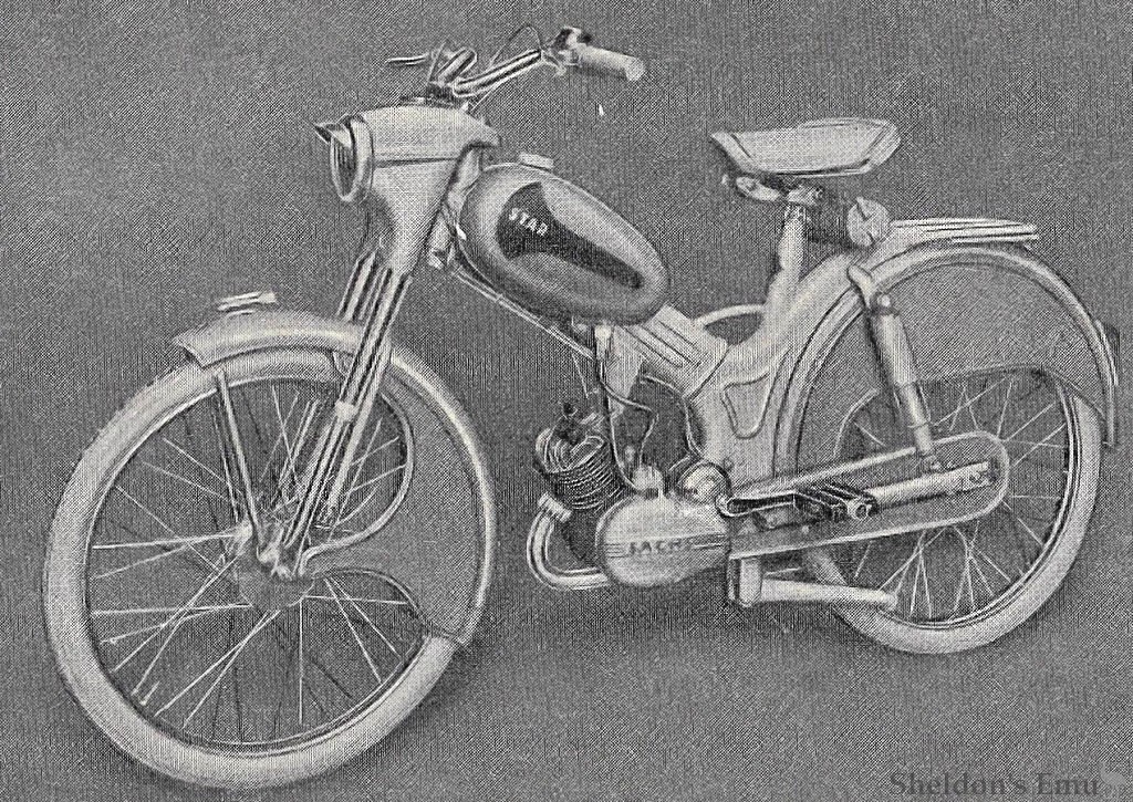 One of the last (latest?) productions of the Star was its 98 cm3 Star Sachs, with two-stroke and two-speed engine, with single engine of 48/54 giving 2.5 HP. at 3,500 revolutions, with 6 compression. Ignition was by Bosch magnetic flywheel. This small machine had chain transmission, an oleo-pneumatic telescopic fork and front brakes and back. For a road speed of 50/60 km/h, the consumption recorded was less than two liters of mixture oil-gasoline.