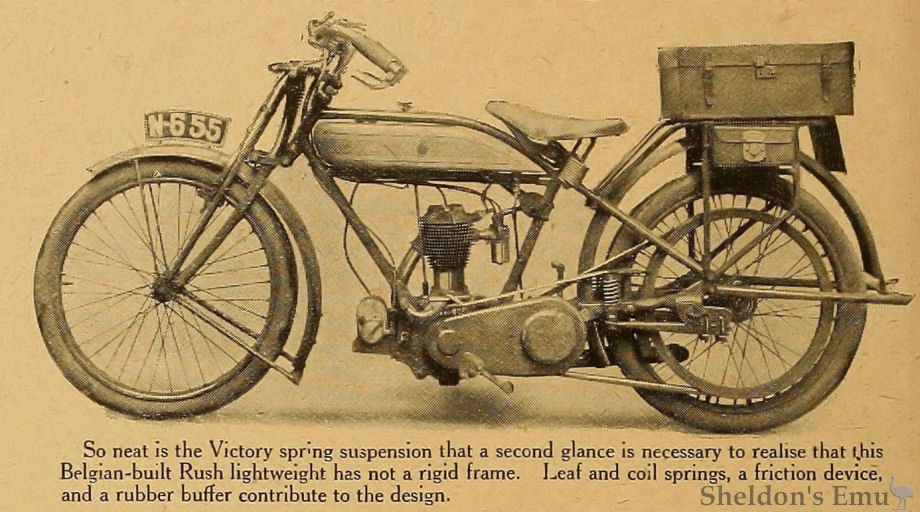 So neat is the Victory spring suspension that a second glance is necessary to realise that this Belglan-built Rush lightweight has not a rigid frame. Leaf and coil springs, a friction device, and a rubber buffer contribute to the design.