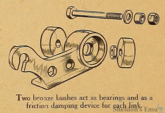 It will be seen that the rear wheel is carried in a short link pivoted from the rigid chain stays. The fork-ends of these links have wide faces, and are rigidly dogged to special axle members, so that no twist can take place, and the links on each side must rise and fall together. Enormous areas are provided for the bronze pivot bearings, and a web in the bearing is gripped between the faces of the two bronze bearings so as to provide a friction damping device and sideways location. Should side wear develop after long use, the location can be corrected by facing off a steel distance piece. Attached to either link is a short laminated spring having a loosely mounted extension bolt at the front end. This bolt passes through the chain stay, and is attached to a compression spring above the stay, a rubber stop being provided between the stay and the leaf spring.