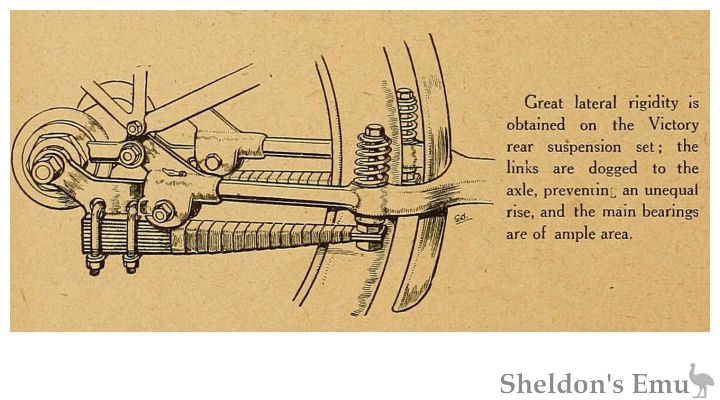No spring frame will give a badly damaged road the smoothness of a billiard table, despite the claims of many enthusiastic inventors. At the same time we may fairly say that the Victory frame was at least as comfortable as any system of motor cycle suspension that we have yet tested, and the majority of them much more complicated designs.
