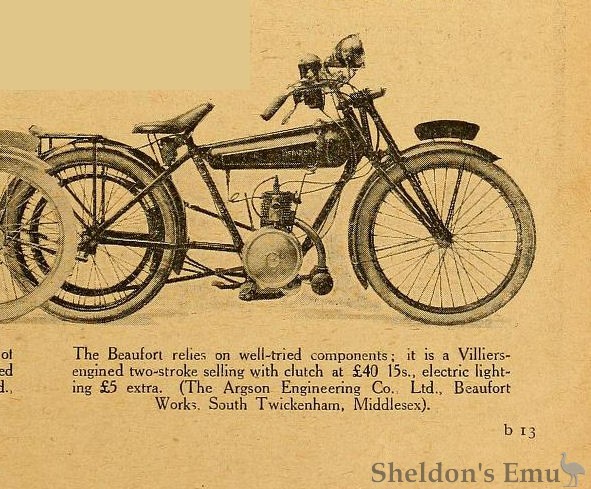 1921 The principal product of this company in its early days was the manufacture of a specially designed and adapted light motor tricyle. This machine was specifically intended for use by invalids who had lost a limb as as result of World War I. There were very many such individuals and so there was a large market for the machines. The tricycle had a single front wheel and the other two fastened to a common rear axle, and driven by the company's own Beaufort 170cc engine. The same engine also appeared in the Beaufort lightweight motorcycle built by Argson. It was also sold to other assemblers of lightweight motorcycles.