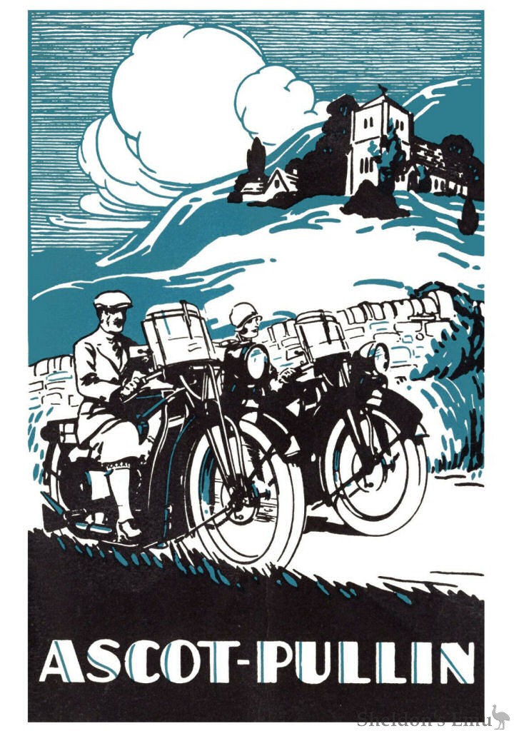 1928 The Ascot Pullin was announced as the New Wonder Motor Cycle. This innovative machine had a horizontally set 498cc ohv engine; in-unit three-speed gearbox; gear-driven magneto and dry-sump lubrication, all enclosed by a pressed-steel frame. Also specified were wire wheels with drum brakes, interconnected and with hydraulic actuation - the first use of hydraulic brakes on a motorcycle. Also included was a telescopic centre stand. It was even fitted with an adjustable windscreen and optional wiper, leg shields and rear-view mirror. Only about 400 to 500 machines were ever built as, sadly, the performance was sluggish and handling poor, so few were sold. Also announced was a sidecar model with a monocoque structure and this was equally unsuccessful.