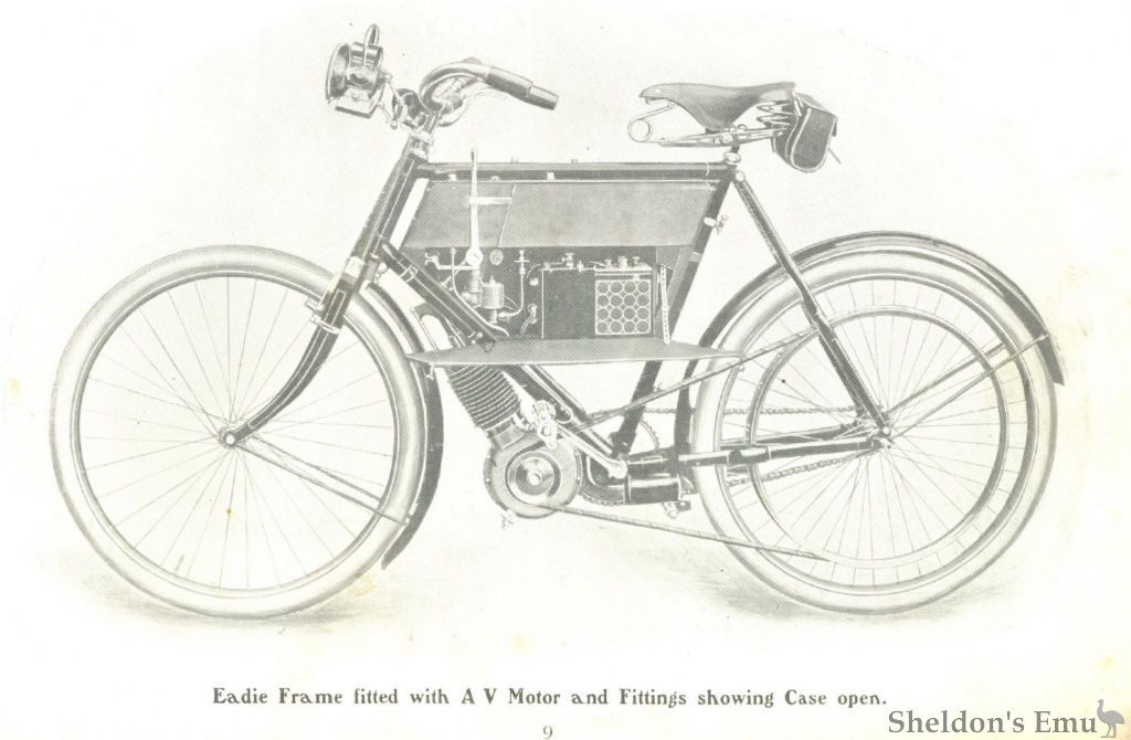 Their 1903 catalogue offered a motor set consisting of engine, brass fuel and oil tanks and a wooden case which contained them, carburettor and ignition components, cables and all necessary fitting to assembles a complete motor cycle using, typically, an Eadie frame.