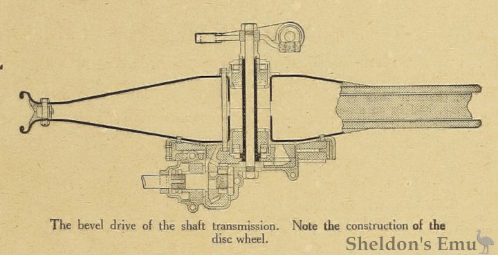 The bevel drive of the shaft transmission. Note the construction of the disc wheel.