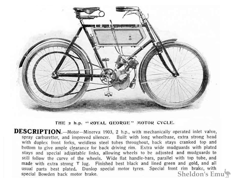There is also a listing for a Royal George driven by a 2hp Minerva engine with mechanical inlet valve, front rim brake, and Bowden motor brake at the rear.