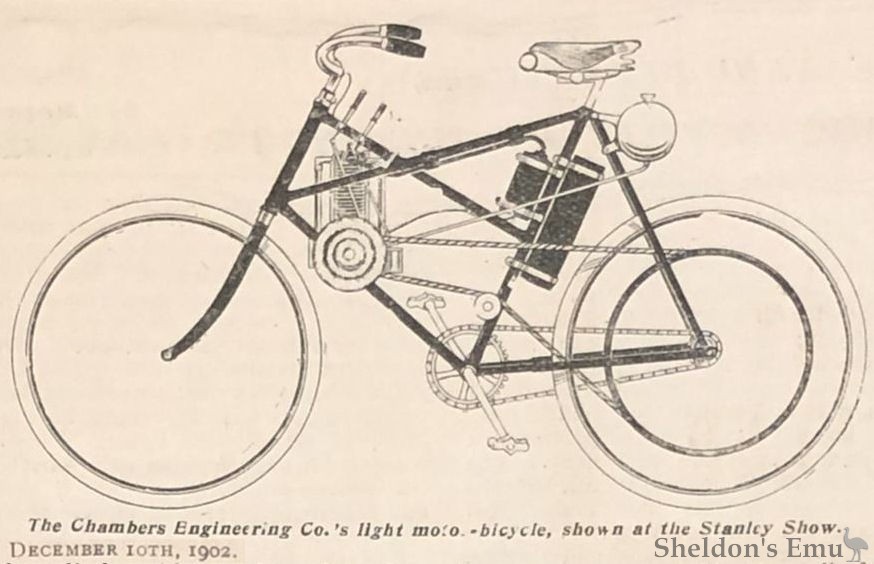 At the late-1902 Stanley show the company exhibited three machines. One had a Clement-Garrard engine mounted in a cross-framed cycle; the second had a 2¾ hp Kelecom engine and both had chain drive. The third had a vertical 3½ hp engine with outside flywheel, spray carburettor, and belt drive.