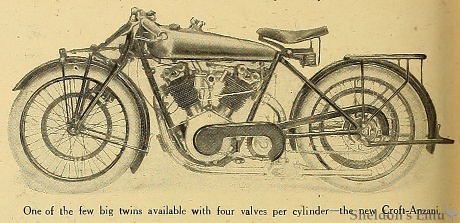 The company's production was always small-scale. They built big twins with bulbous saddle tanks that looked similar to the Brough Superior. The machines were fitted with Anzani 996cc V-twin ohv engines and their best-known model was the Super Eight. The Croft-Anzani V-twin of 1922 had four valves per cylinder, Montgomery forks, chain drive, rim brakes front and rear, and a saddle tank. The Sturmey-Archer gearbox was a close-ratio unit, it had an Enfield cush drive in the rear wheel and an engine shock absorber on the primary drive sprocket.