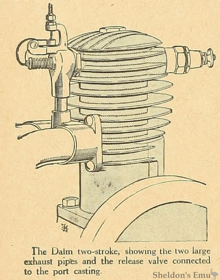 AMONG the most interesting of the medium-powered air-cooled two-stroke engines the Dalm engine takes a high place. It is designed and manufactured throughout by J. C. Dalman and Sons, of River Street, Birmingham, and not the least wonderful point about it is the fact that no material alteration has been made to the original design. The cylinder has a bore and stroke of 73 x 76 mm., giving a capacity of 318 c.c. The transfer pipe is cast with the cylinder, and one of the first points to strike the eye is the great area of the exhaust ports, which discharge the gas into two separate pipes each of lin. full inside diameter. The transfer ports also are of interest, for though the gas enters the duct by two large ports it is distributed over the face of the baffle by four smaller ones. A release valve placed in front of the cylinder is arranged so that the gas is led directly into the exhaust box casting thus helping largely towards the ideal of a clean engine. The piston is domed somewhat less than is the case with the average two-stroke, but the baffle is extended somewhat above the dome so as to prevent loss of gas through the exhaust port.