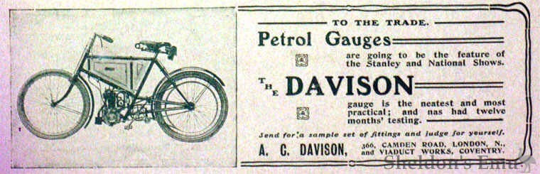 A. C. Davison of Viaduct Works, Coventry produced motorcycles from 1902 to 1908. The machines were primitive and were fitted with 2hp and 2¾ hp Simms or 2hp Minerva engines. The 1904 model had both petrol and oil gauges.