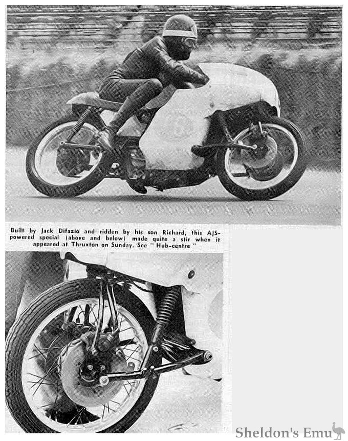 Built by Jack Difazio and ridden by his son Richard, this AJS-powered special (above and below) made quite a stir when it appeared at Thruxton on Sunday. See "Hub-centre"