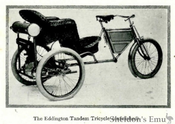 have broken away entirely from the usual lines of two-seated motor cycle design, and exhibit upon this stand two very workmanlike samples of their manufacture. The first to claim attention is an unfinished one fitted with a 4 h.p. water-cooled engine. This is placed in the rear of the live axle, which drives through a Dupont two-speed gear, admitting of free engine. In this respect the drive may be said to resemble that of a quad. The framework around the engine is of particularly strong construction, being duplicated in plan. From the centre of the forward axle a large tubular member runs forward to the bottom bracket. A supplementary transverse member placed just above and slightly in rear of the previously mentioned member carries the springs of the rear seat. From this member a tube runs up to the seat-pillar lug. Forward of the seat tube itself ordinary bicycle practice is followed, the front forks, of course, being suitably strengthened and provided, with stay tubes.