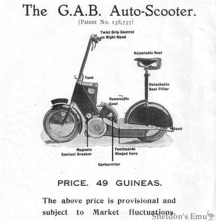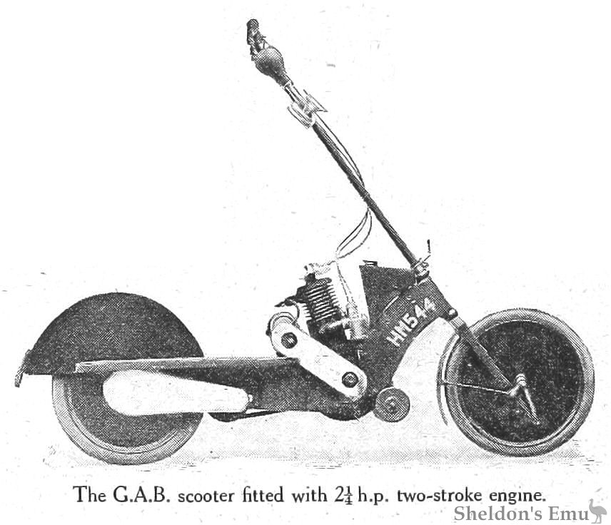 After the end of World War I there was a boom in scooter production. The GAB was a relatively basic machine which failed to gain a market share. It had a pressed-steel platform for the rider to stand upon, a New Hudson engine that drove the rear wheel via a countershaft and a small fuel tank. The forks had small leading links, the bars were carried by a long extension and the machine was fitted with small disc wheels. A patent drawing showed a detachable seat pillar.