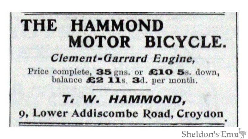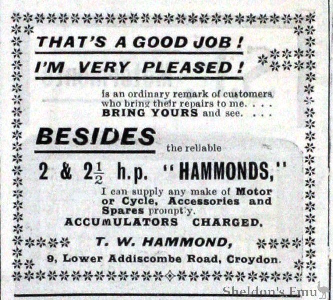T. W. Hammond built motorcycles at 9 Lower Addiscombe Rd Croydon, Surrey in 1902, 1903 and possibly other years.