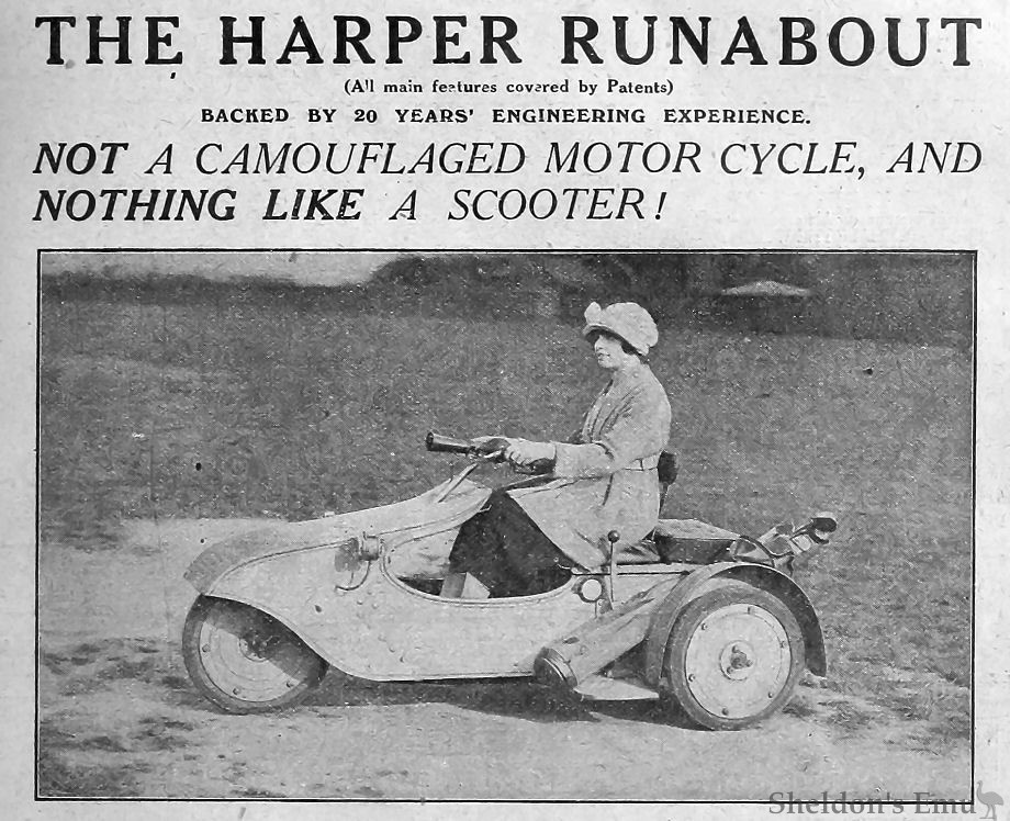 The Harper runabout stands in a class by itself. Its designers, recognising the demand for an exceptionally light, handy vehicle giving complete weather protection, have succeeded in producing a most, attractive little three-wheeler. Low upkeep and running costs are claimed for it, and, considering the power unit is only of 269 c.c. capacity and the entire weight only 280 lb., the claim may well be justified. A three-speed gear, chain transmission giving direct drive on all speeds, Zenith carburetter, independent foot and hand brakes, starting from the seat by lever, and foot acceleration are details which go to the making of a workmanlike little runabout.
