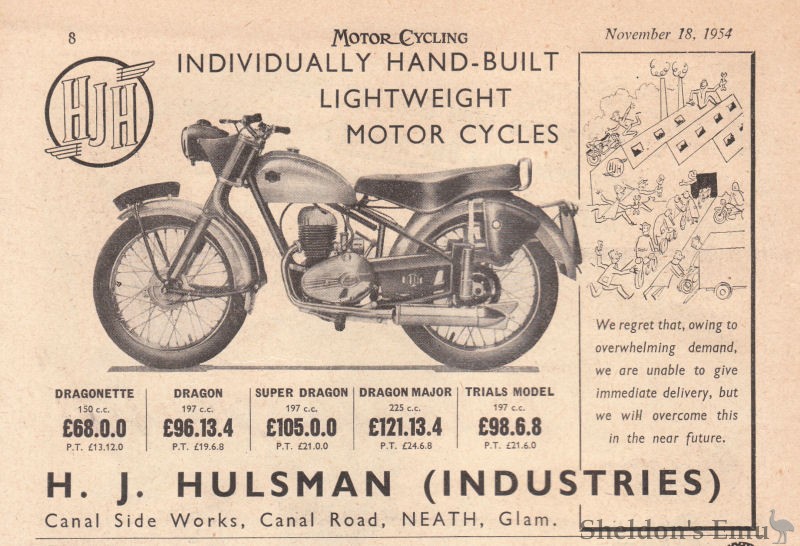 HJH motorcycles were produced from 1954 to 1956 by Henry John Hulsman of Neath, Glamorgan.