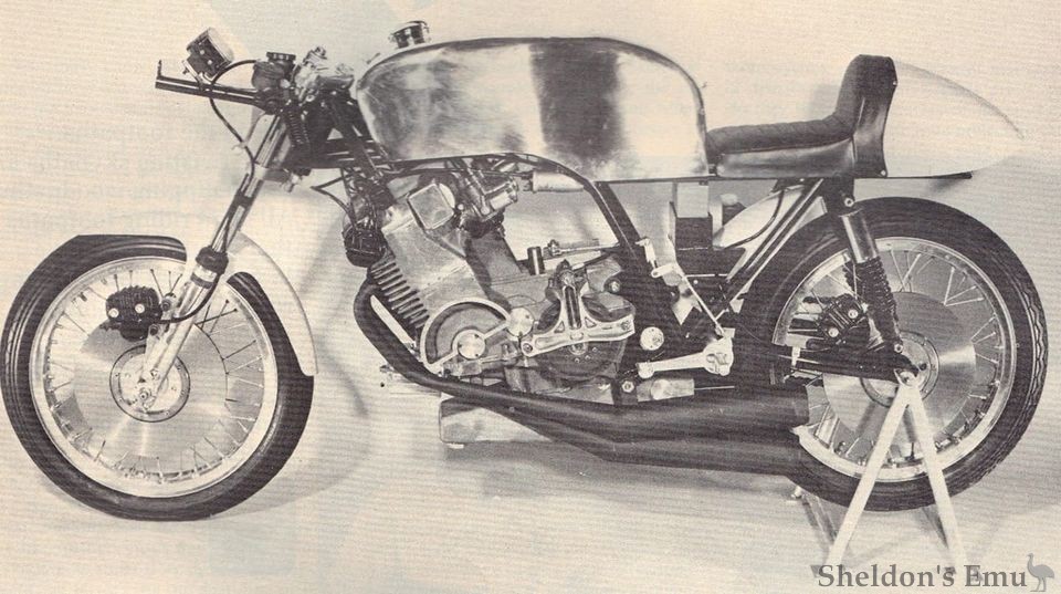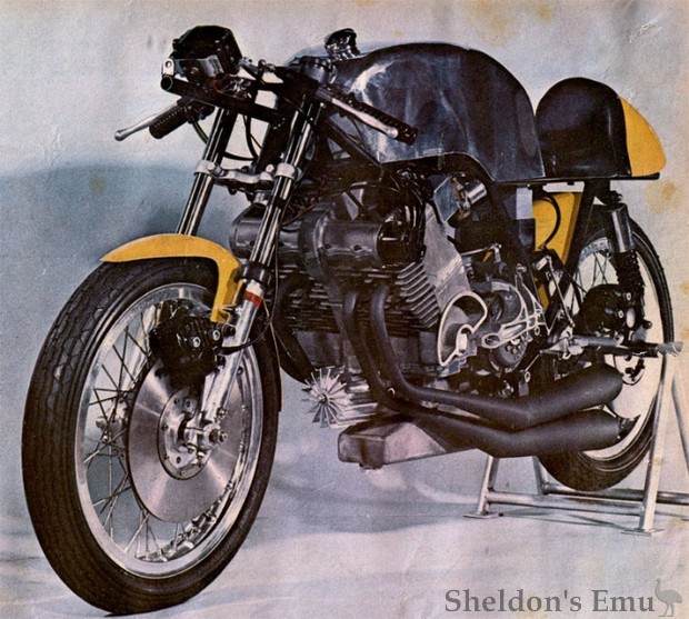 Early in 1973 a racing four was exhibited at a London show. Typically in the style of the period, it had the cylinders inclined forward, DOHC, four carburettors, four exhaust pipes with megaphones and Lumenition electronic ignition. The crankcase was split horizontally and the crankshaft ran on six plain bearings, and there were plain big-ends. A centre gear drove a countershaft, there was chain-drive to the camshafts, the ignition rotor and a distributor mounted on their ends.