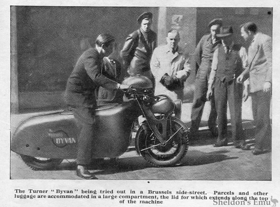 The Turner "Byvan" being tried out in a Brussels side-street. Parcels and other luggage are accommodated in a large compartment, the lid for which extends along the top of the machine.