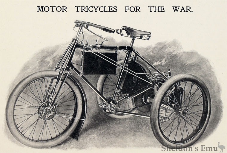 Production began in 1898 with MMC tricycles and copies of the De Dion engine. These were used by the British Army in the Boer War. They also advertised the Motocyclette, with the engine over the front wheel, which it drove by belt.