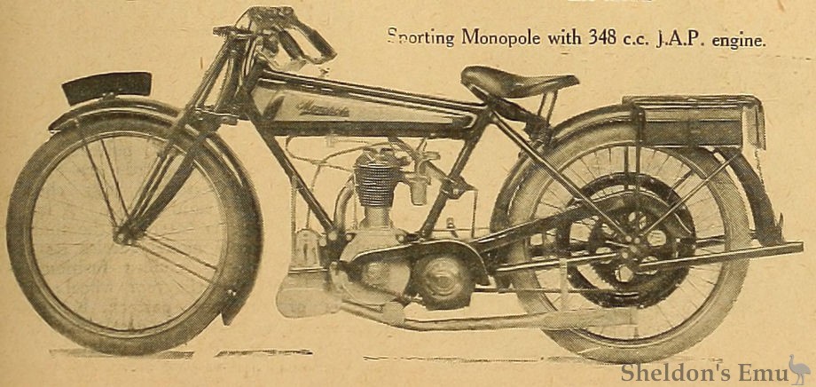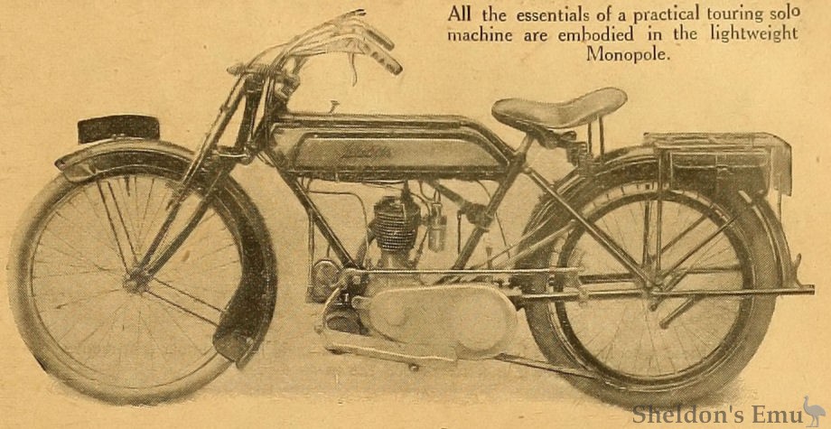 The Monopole Cycle and Carriage Co., Ltd., Fokshill. Coventry. -- The Monopole machine was described in The Motor Cycle of the 21st, page 1335, and it therefore suffices for the moment to say that it is designed upon standard lines and has no particularly outstanding features beyond its obvious good workmanship and sturdiness of construction. Saxon spring forks are used.