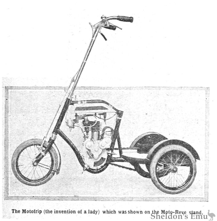 The machine was a three-wheel scooter exhibited at the 1911 Olympia show, on the Moto-Reve stand. It had a 1¼ hp M-R engine with belt drive to the rear axle, but only one of the 10-inch wheels was driven. It had a loop frame, cycle forks and caliper front brake. There was a platform between the rear wheels for the rider to stand on.