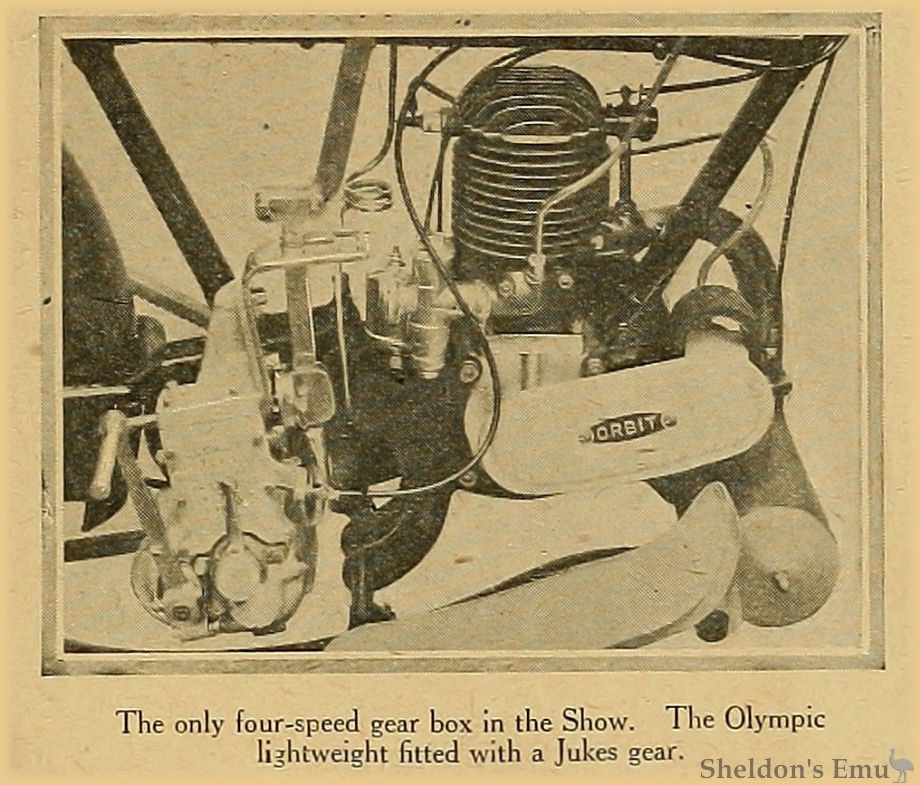 This exhibit comprises single gear and multi-speed lightweights fitted with the Orbit engine. The most interesting item of the specification is the swinging bracket on which the gear box is mounted in the multi-speed models. The bracket swings on a pivot pin; its arc of travel is adjusted by two set screws locked by four nuts, so that the chain tension can be set to very fine limits without any possibility of disturbing the alignment. Any make of gear box can be fitted to this bracket, and the requisite variations of chain or belt line are easily made with the aid of an adapter boss for the flywheel. Actually the gear box fitted to the Show machine is a Jukes four-speed with gate change; the gears are in constant mesh; the lever is self-centring, and is made of two parts bolted together so that the position of the lever can be adapted to suit the rider's taste. It is intended to fit a three-speed and reverse box to a new model with four-stroke engine for sidecar-work, which is in course of preparation. The multi-speed model weighs 195 lb. fully equipped for the road, and inclusive of a kick-starter and clutch. The single gear model weighs only 146 lb. All the frame tubes are straight; every nut and pin on the machine is spring-washered; the mud-guards are very wide, and the flywheel is enclosed in an aluminium casing. A Swan spring fork is fitted, which is worth examination, as its suspension is obtained by two helical springs enclosed in a telescopic case which is filled with grease and is air-tight, so that a certain pneumatic action is obtained.