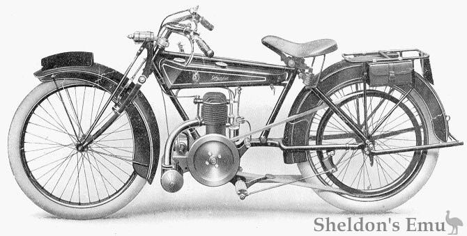 1919 The name returned shortly after WWI when the Granville Street works built a range of good-quality models. The first machine was powered by a Verus 268c.c., two-stroke engine. It had a two-speed gearbox, was fitted with a belt drive, and sold for £80. A selection of engines was used from Villiers, Blackburne, Wiseman or Orbit. The frame was designed to suit these engines and there was a patent swinging gearbox mounting, which allowed for simple adjustment of the transmission.