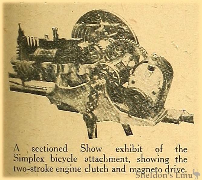 A sectioned Show exhibit of the Simplex bicycle attachment, showing the two-stroke engine clutch and magneto drive.