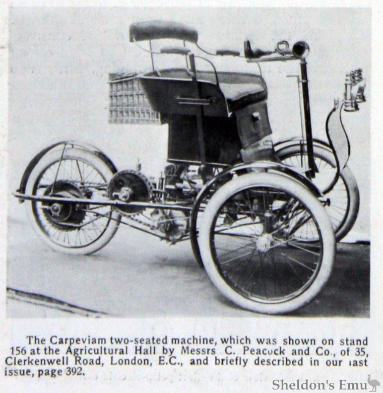 A great variety of accessories of all descriptions, and particularly those in connection with ignition systems., are exhibited by Messrs. Charles Peacock and Co. on Stand 95a. The principal items of interest are in the engines shown on this stand. One is of the two-cylinder variety, with cylinders inclined one to another at an angle of about fifty degrees. The cylinders have a bore of 68 mm. and a stroke of 72 mm., and, running at a speed of 1,200, develop 4½ h.p. A belt pulley fitted is for a flat belt. The crank chamber is fitted with double clip bosses. A two-cycle engine suitable for a bicycle is also seen on this stand. Running at 1,800 revolutions per minute, it develops 2¼ h.p. There are no valves whatsoever, excepting the piston, which in itself acts both as the inlet and the exhaust valve. The total weight of the engine is 18 lbs. (Stand 95a.)