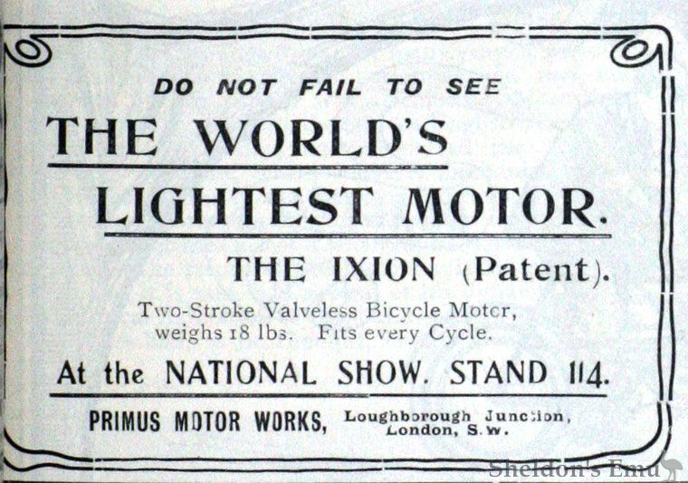 114. The Primus Motor Co., London are showing three machines fitted with the two stroke motor. This motor has beer described in "Motor Cycling", but several improvements have been introduced, notably in the carburetter. The sparking mechanism is improved considerably. The machines are fitted with spring seat pillars and are of good finish throughout. This is the lightest motor-bicycle on the market, scaling only 65 lbs., and the price remarkably reasonable, viz., £27 10s. complete, or outfit £15 15s. For next season the company will have a belt driver on the market, in addition to the front driver; this will have the motor fixed on the main down tube in a vertical portion. This type of motor has no valves or timing gear, and its construction is exceedingly simple, moreover, it can be adapted to the average roadster bicycle.