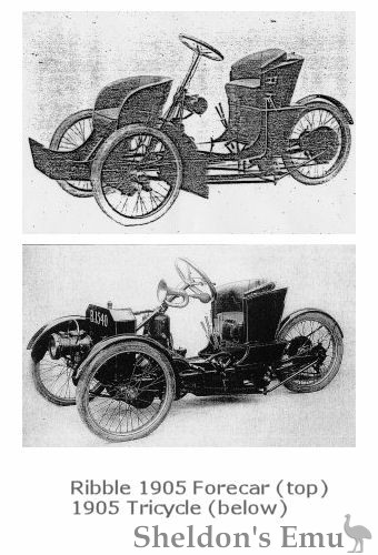 In 1905 they offered the Ribble 4½ h.p Tandem forecar and an 8 h.p. solo saddle tricar, both using water cooled engines which delievered power to the single rear wheel by chain. Production ceased in 1908.