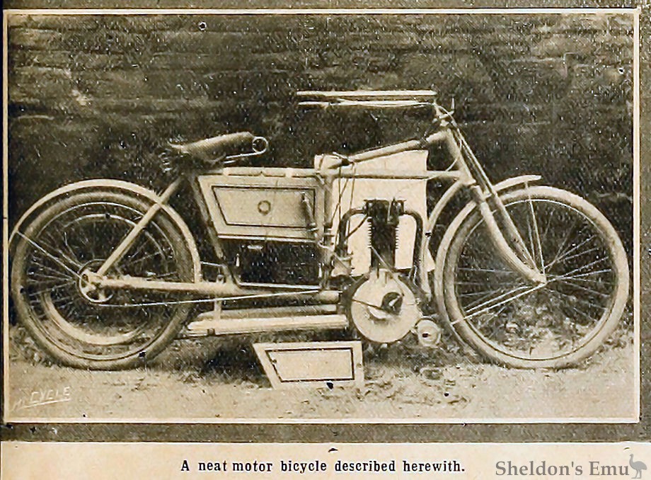 The ignition is by coil and accumulators, which are carried in a wood case underneath the petrol and oil tank. 26in. wheels are fitted. 2¼in tyres, two brakes (band rim and belt rim), both operated by foot and the weight of the complete machine is as low as possible.