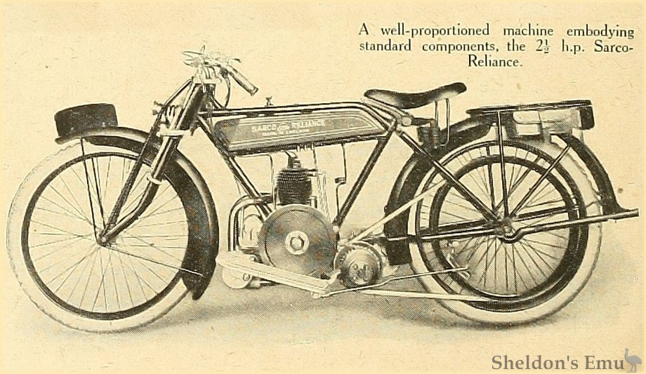 Embodying the large experience of extensive Overseas trade, the Sarco-Reliance has been designed by Messrs. Sanders, Rehders, and Co., Ltd., of 108. Fenchurch Street, London, E.C.3. A 68x72 mm. two-stroke engine having double exhaust pipes, a Burman two-speed gear box with hand-controlled clutch, and a kick-starter are fitted to one model, which retails at £85; a similar machine, but without clutch and starting pedal, is sold for £77 10s. C.A.V. magneto and Saxon forks form part of its good-class equipment; while, in order to render it in every way suitable for hard usage Overseas, the frame is constructed of slightly heavier gauge tubing.