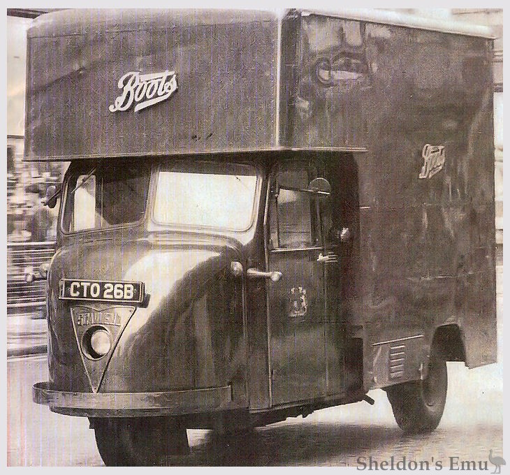 This was a large 3-wheeler with wooden cabin mounted on a steel chassis, available with either a 3 ton or 6 ton payload capacity.