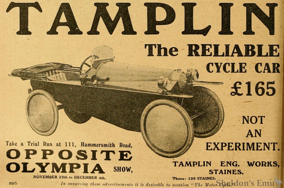 Tamplin Engineering Co of Kingston Road, Staines, Middlesex was established in 1919 by Edward Alfred Tamplin. He acquired a design of a cyclecar by John Valentine Carden, a man of considerable talent who later became involved in aviation.