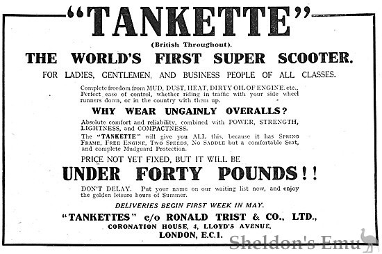 Weighing 135lb, and measuring 6ft 5in over all, the Tankette will be marketed by Messrs Ronald Trist and Co of Watford, who for many months have experimented with various forms of scooters, commencing with a small toylike machine with 10in wheels in diameter. Just one step further, and the Tankette would be a light-weight motor cycle ; hence it can be regarded more as a competitor of existing light-weights than of the scooter proper.
