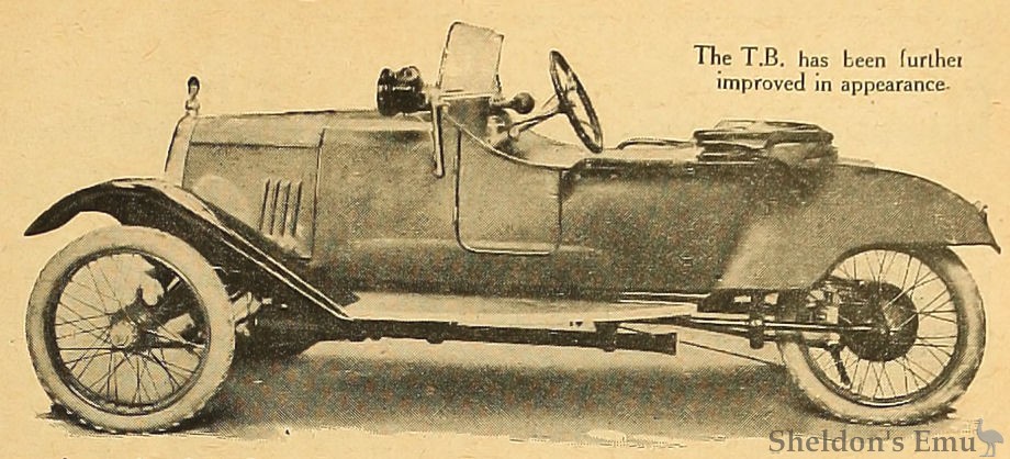 The essential feature of any three-wheeler is its chassis design, this point having more bearing on the success of the vehicle than any other. In the T.B. chassis every possible weakness has been closely studied, and the result is a sound and satisfactory design. Rear springing is by semi-elliptical springs mounted on the cantilever principle, the front being of the quarter-elliptic type. All three wheels are interchangeable, the spare wheel being carried on the off side of the body. A big improvement, too, has been effected by the introduction of a ratchet brake acting on an external contracting band instead of the internal expanding type. In general appearance the T.B. is good, and there is a cleanness and finish about all the models which, adds distinction to a pleasing range. At £155 the standard air-cooled T.B. is an attractive proposition, while for an additional £10 a water-cooled engine can be fitted, as well as several refinements in detail. T.B. three-wheelers have done remarkably well in competitions, and those who favour a sports model can obtain one with the guarantee of 50 m.p.h. Its price is £175. Family men are also catered for with a model having a type of body known in the car world as the "clover leaf"; on the T.B. this arrangement gives accommodation for a child between and slightly behind the two normal occupants.