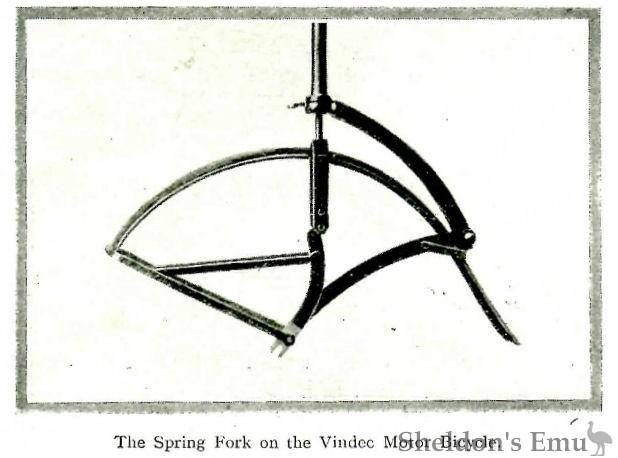 The well known Vindec bicycle, which has given considerable satisfaction during the current year, has undergone several important improvements. Some of the machines shown are fitted with magneto ignition, the dynamos being geared on to the engine. The Truffault spring forks, which are fitted to order, the makers claim, render the riding most luxurious. The step is screwed on to the chain stays direct, and is quite independent of the back wheel and spindle. Thus the machine can be placed on a stand, and the rear wheel taken out with ease.