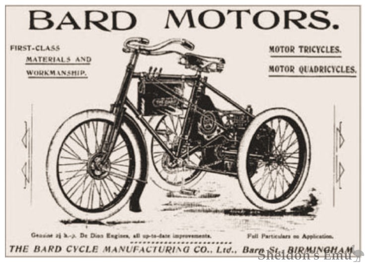 The Bard tricycle had a 2¼ hp De Dion engine hung out behind the rear axle in a heavy-duty frame with braced forks. The fuel tank went behind the saddle and the battery box under the top tube. The front wheel was fitted with an external-contracting band brake.
