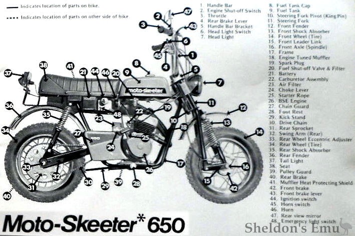The Moto-Skeeter came in at least three models. A 1972 model had a 72cc two-stroke engine, auto transmission, alloy guards, drum brakes front and rear, and a fuel guage integral with the tank cap.